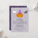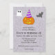 Este é para qualquer pessoa que tenha aniversário antes ou no Dia das Bruxas e pode ser usado para pessoas de todas as idades, apesar de alguns elementos parecerem fofos. O foco principal deste é a abóbora com um chapéu de festa. Este cartão apresenta elementos personalizáveis que podem ser alterados usando o botão azul "Personalizar este design". Você pode alterar o nome e a idade da pessoa, a data e hora da festa, o local da festa e as informações de confirmação de presença.