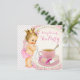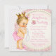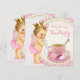 Convite de chá de bebê com tema de chá da princesa para menina com adorável bebê princesa rosa vestindo calças rosa franzidas, colar de pérolas e linda coroa rosa e dourada. Este adorável convite de chá de bebê com tema de xícara de chá de princesa rosa e pérola é facilmente personalizado para o seu evento, adicionando os detalhes do evento, estilo de fonte, tamanho e cor da fonte e texto.