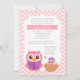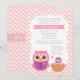 Um chá de bebê temático de livro é perfeito para trazer um livro para a mamãe, para que ela possa construir uma biblioteca e ler uma história na hora de dormir todas as noites para o bebê. Este convite de chá de bebê de coruja é ótimo para isso, com seu adorável par de corujas. A coruja mãe está lendo um livro de histórias para dormir para seu filhote de coruja que está usando uma touca de dormir e que está aninhado agradavelmente no ninho. Escolhas de cores adoráveis e doces de rosa e roxo tornam-no perfeito para mães que estão tendo meninas. Chevron clássico rosa e branco para o fundo. Personalize facilmente com os detalhes do chá de bebê da menina.