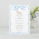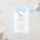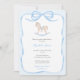 Este doce convite de chá de fraldas ao estilo vintage apresenta um eterno de balanço com sotaques azuis e um arco azul elegante com estrutura de fita. Estes elementos foram pintados manualmente por mim em aquarelas antes de serem digitalizados em forma digital. O inverso do convite é um simples padrão de ponto azul claro.