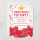 Um convite de festas de chá Feliz de Natal com um bule ouro amarelo com flores vermelhas poinsettia brilhantes ilustrado com aquarelas acentuadas com espuma. Você pode editar o texto para ajustado das suas necessidades. Encontre adesivos de chá de Natal no meu compro também!