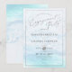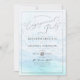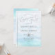 Convites de festa de compromisso da PixDezines com litoral azul cristalino iridescente, um evento de areia e mar com bolhas de champanhe em prata. O design é acentuado com elegante escrita em caligrafia em prata falsa com moldura removível.