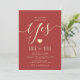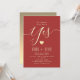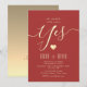 Caligrafia simples, convite de festa de compromisso vermelho elegante com coração falso dourado e monograma de nomes completos atrás.