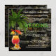 Um convite caprichoso para recepção de casamento ou pós-casamento com um coquetel tropical com palmeira em um fundo de parede de pedra escura. As letras neon dizendo "Casamento" podem ser arrastadas ou excluídas. No editor avançado, você também pode escolher um texto neon dizendo "Celebre" (na parte inferior de todos os textos e arquivos de imagem). Lindos para um casal que não quer uma celebração de casamento tradicional.