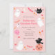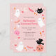 Convide convidados para a sua festa de fantasia de halloween com este convite fofo. O design apresenta abóboras, gatos pretos, fantasmas bonitos, faíscas brilhantes, e outros sinais da estação todos em tons amigáveis de rosa. Personalize com seus próprios nomes e detalhes da festa!