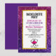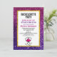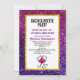 Festa de despedida de solteira com um design sofisticado e elegante. O fundo é composto por gemas cintilantes rosa e roxas. Estilo feminino e moderno. Um retângulo com uma borda de folha de ouro falso sobreposta com o seu texto dentro. Um copo de vinho desenhado à mão com vinho rosa intenso dentro abaixo do texto.