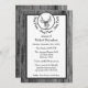 O design da festa de despedida de solteiro apresenta uma fotografia em preto e branco de tábuas de madeira rústica ao fundo. Há um retângulo branco sólido com acabamento cinza escuro com texto personalizável em fonte preta. No topo há um círculo branco com acabamento cinza escuro. No centro há um desenho a lápis em preto e branco de uma cabeça de cervo/macho. Ao redor do círculo há um texto que diz Stag Party. Stag Party. Stag. Stag Party. O verso do convite tem a mesma fotografia de madeira em preto e branco. Este é o convite perfeito para a sua despedida de solteiro.