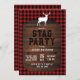Convite de despedida de solteiro rústico com a silhueta branca de um cervo, xadrez búfalo vermelho e grão de madeira. Convite de despedida de solteiro com xadrez búfalo vermelho com fontes legais e grão de madeira impresso. Convite de despedida de solteiro com grão de madeira com um cervo branco e um fundo xadrez vermelho e preto.
