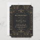 Convite de casamento Royal Gold Black Great Gatsby. Design de cartão real, romântico e vintage com estilo art déco de Great Gatsby, velho Hollywood dos anos 20, com sobreposição de Fleur-de-lis em folha de ouro, divisor e fontes lindas em um fundo preto texturizado. Use a ferramenta Personalizar para adicionar suas informações. Para mais, visite minha Coleção Royal Gold Black Great Gatsby.