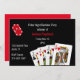 Convite de despedida de solteiro feito em preto e vermelho com tema de poker. Gráficos de fichas de poker vermelhas e cartas de baralho decoram o convite preto. Personalize todo o texto para a sua festa de despedida de solteiro.