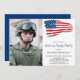Convites de festa de despedida para soldado com bandeira americana dos EUA. Estes convites de festa com a bandeira americana modernos são perfeitos para uma festa de despedida de um soldado, despedida de implantação militar, celebração de boas-vindas a casa de militar, formatura militar e aposentadorias militares. Personalize este convite com bandeira americana com a foto do seu soldado, evento, nome e detalhes da festa.