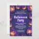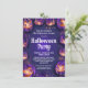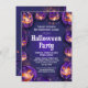 Luzes de fada roxas e laranja e abóboras noturnas brilhantes de Jack-O-Lanterna com tema de halloween. Convide convidados para uma festa de fantasia de halloween com este convite impresso personalizado. Gráficos de ai generativos na moda personalizados com detalhes personalizados do seu partido. Excelente para um partido gótico elegante ou adulto, familiar ou adolescente que é apenas ligeiramente assustador.