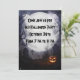 Uma lua de cheio sobre um cemitério escuro, com um jack o'lantern a presidir no chão, faz um convite à festa de Halloween assustador e divertido. A parte traseira é cinza leve, com informações adicionais para a parte, se necessário.