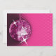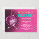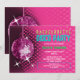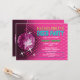 © Socialite Designs Inc. Comemore a festa de solteira da noiva enviando esses convites de festas de bola rosa-divertida. Personalize facilmente o texto do seu evento substituindo o texto do modelo. O design incorpora uma bola magenta de disco, fundo cor-de-rosa com reflexões e estrelas que podem ser movidas e redimensionadas. O texto é feito para se parecer com luzes de néon.