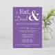 Convide amigos e familiares para ajudá-lo a celebrar seu casamento recente com este convite de festa de elopamento retrô e descontraído Coma, Beba & Seja Casado! roxo e branco.