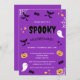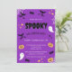 Festa de Crianças Bonitas do Halloween Convite com fantasmas brancos, abóboras, teias de aranha e morcegos contra um pano de fundo roxo brilhante. Também disponível como download digital.