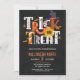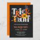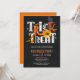 O design bonito apresenta uma ilustração de truque ou trapaça de aranha branca, monstro, chapéu de bruxa, morcego e rede. Personalize com seus detalhes de festa de aniversário de Halloween em letras laranja e brancas em fundo de quadro.