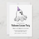 O pequeno fantasma com o seu chapéu roxo está pronto para uma maravilhosa festa de fantasia de Halloween.