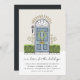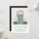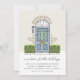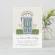 O encantador convite de festas de casas de férias apresenta um esboço de uma ilustração azul da porta, flanqueada com arbustos verdes e uma coroa de Natal, com "nova casa para as férias" em letra de sic manuscrita. Personalize com seus detalhes de celebração abaixo.