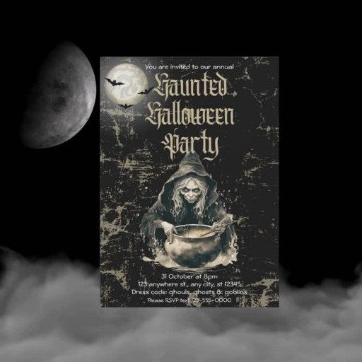 Convite de festas de fantasia de bruxas de bruxas de Halloween. Este cartão de convite apresenta um design preto e gótico com fundo preto sujo. Os sotaques do ouro rústico do ornamentado enquadram o cartão, enquanto o título do evento, "Festa de Halloween Assombrada", é exibido em um roteiro gótico de ouro estranho. A sutil imagem de uma bruxa assustadora misturando sua poção mágica e uma lua de cheio melhora a atmosfera sombria, convidando convidados para uma noite de encontros assustadores.