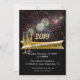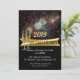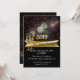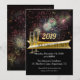 Convite para festa de Ano Novo em dourado e preto com belos fogos de artifício coloridos ao fundo. O copo de champanhe adorna o primeiro plano com uma faixa dourada de gradiente deslumbrante com "Festa de Ano Novo".