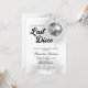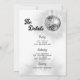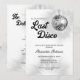 Este convite para festas de solteira mostra um tema de discoteca retrô com uma bola de prata e texto do estilo de 1970. Este convite é perfeito para um fim de semana de despedida de solteira e oferece texto personalizado na parte de trás para o seu itinerário.