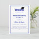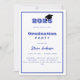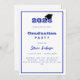 Um convite moderno e na moda para uma festa de formatura. Para ele e para ela. Fundo branco, texto azul e um quadro. Um boné de formatura preto.