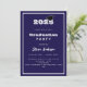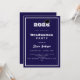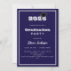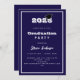 Um convite moderno e na moda para uma festa de formatura. Para ele e para ela. Fundo azul, texto branco e um quadro. Um boné de formatura preto.