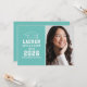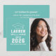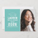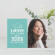 Anuncie seu segundo grau ou formando universitário em estilo com este anúncio de graduação e convite de festas. A placa de dois lados apresenta um retrato mais velho do formando com boné formando e design de tipografia branca simples e moderna. O fundo azul do ovo do aqua ou do robin pode ser alterado para uma cor diferente com o recurso "Personalizar" e, em seguida, Editar / Fundo para selecionar outra cor.