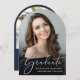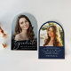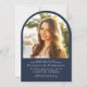 Comemore suas conquistas de formando com este elegante anúncio de graduação em forma de arco e convite de festas com "Formando" em um roteiro branco na moda sobre a foto do formando e seu nome, ano escolar e de aula em tipografia elegante de serifa branca. No verso, juntar uma fotografia adicional e os detalhes da festa de formatura em letras brancas sobre fundo azul.