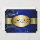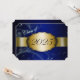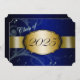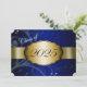 Convite de festa de formatura azul e dourado com floral azul claro e escuro e uma fita dourada atravessando mostrando o ano de formatura. O verso do cartão é azul com fonte dourada clara para as pessoas preencherem os anúncios da festa de formatura.