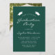Este convite clássico e moderno para a festa de formatura apresenta um texto branco sobre um fundo verde escuro. A palavra "Graduação" e o nome do formando aparecem em letra casual moderna, sob um par de bonés de conselho de argamassa branca. Personalize o convite com detalhes da parte e substitua a imagem de exemplo no verso por uma foto do seu formando.