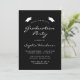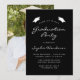 Este convite clássico e moderno para festas de formatura apresenta texto branco sobre fundo preto. A palavra "Graduação" e o nome do formando aparecem em letra casual moderna, sob um par de bonés de conselho de argamassa branca. Personalize o convite com detalhes da parte e substitua a imagem de exemplo no verso por uma foto do seu formando.