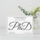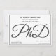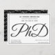 Um convite para festa de formatura de doutorado em preto, cinza e branco. Este convite também tem um padrão da palavra PhD, em script, atrás.