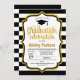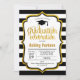 Convite de festa de formatura com faixas brancas pretas design simples elegante e elegante com fonte falsa de ouro brilhante e script. Perfeito para uma festa elegante.