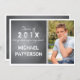 Uma peça no clássico quadro negro este design anuncia a formatura do seu filho em letras negrito. Um alternativo único e divertido! Mostrado aqui como um convite de festas, todo o texto no verso pode ser personalizado para mudar para apenas um anúncio.