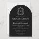 Este clássico, elegante design de convite para festa de formatura apresenta um monograma branco inicial em letra serif aberta rodeada por uma crista de acanthus de uma crista preta em forma de arco de tendência. Personalize o texto com o nome do formando e os detalhes da parte. A parte traseira da placa é preta e sólida. Ideal para segundo grau, faculdade ou formando universitário.