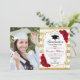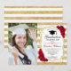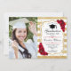 Festa de formatura com sua foto. Possui listras brancas douradas, fonte de script, rosas vermelhas, tassel e confetti. Design clássico com ouro falso brilhante. Perfeito para uma celebração elegante.