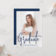 Convite de festa de formatura moderno com sua foto vertical na frente e "Graduate" exibido em uma sobreposição de texto manuscrito em azul-marinho. Personalize a frente do convite de festa de formatura com foto com o nome do formando, nome da escola e ano de formatura. O simples convite de festa de formatura se inverte para exibir os detalhes da sua festa em letras brancas com um fundo azul-marinho sólido. O convite de festa de formatura com foto é perfeito tanto para graduados do ensino médio quanto para universitários!