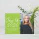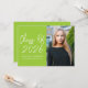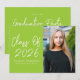 Convites de festa de formatura modernos com "Turma de 2023" em um rótulo manuscrito branco sobre um fundo verde lima. Personalize a frente do convite de formatura adicionando o nome do graduado, nome da escola e foto vertical. O convite se inverte para exibir os detalhes da sua festa de formatura em letras brancas sobre um fundo verde lima.