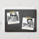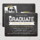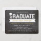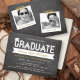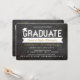 Cartão de Convite de Festa de Formatura com Tipografia Negrito e Fita Simples de Graduado Branco com um Acento de Gorro de Formatura / Boina em um Fundo de Quadro Negro Retro.