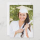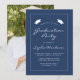 Este convite clássico e moderno para festas de formatura apresenta texto branco em uma borda retangular branca fina sobre um fundo azul marinho. A palavra "Graduação" e o nome do formando aparecem em letra casual moderna, sob um par de bonés de conselho de argamassa branca. Personalize o convite com detalhes da parte e substitua a imagem de exemplo no verso por uma foto do seu formando.
