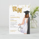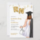 Convite à Festa de formatura da Escola de Enfermagem de Retrato. Enfermeira Curvy Convite para sua filha, sobrinha, mãe, tia, prima ou amiga que se forma na escola de enfermagem e agora é oficialmente enfermeira. Mulheres Enfermando a Graduação Escolar Convite para festas de formando celebrando mulheres que acabaram de se formar na escola de enfermagem. Celebre a nova enfermeira registrada com este elegante convite para a formatura de enfermagem! Apresentando retrato de uma pele clara, mais uma mulher de tamanho com cabelo castanho no comprimento do ombro. O formando da enfermeira está vestindo um vestido branco na moda, um roupão de graduação preto enrolado sobre o ombro, e um boné de formatura preto correspondente. Ela segura balões em forma de folha de ouro com as letras RN numa mão e um estetoscópio na outra mão. Acentuado com o confete dourado, ele captura perfeitamente a alegria e o entusiasmo de sua grande conquista.