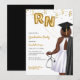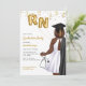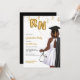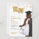 Convite à Festa de formatura da Escola de Enfermagem de Retrato. Enfermeira Afro-Americana Convite para sua filha, sobrinha, mãe, tia, prima ou amiga que se forma na escola de enfermagem e agora é oficialmente enfermeira. Mulheres Enfermando a Graduação Escolar Convite para festas de formando celebrando mulheres que acabaram de se formar na escola de enfermagem. Celebre a nova enfermeira registrada com este elegante convite para a formatura de enfermagem! Apresentando um retrato de uma pele escura, mais uma mulher de tamanho com cabelo castanho ondulado. O formando da enfermeira está vestindo um vestido branco na moda, um roupão de graduação preto enrolado sobre o ombro, e um boné de formatura preto correspondente. Ela segura balões em forma de folha de ouro com as letras RN numa mão e um estetoscópio na outra mão. Acentuado com o confete dourado, ele captura perfeitamente a alegria e o entusiasmo de sua grande conquista.