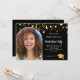 Adicione sua própria foto vertical do formando. Um quadro fotográfico em forma de arco. Uma cor de fundo preto clássica, decorada com estrelas douradas falsas. Personalize e adicione um nome e detalhes da parte.