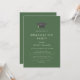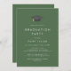 Este convite de festa de formatura boné verde-chic é perfeito para uma festa moderna ao ar livre. O simples design apresenta um clássico caçador de florestas escuras, típico, tipografia verde e branca, com um chapéu de graduação de aquarela preto e dourado.