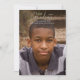 Este cartão de graduação simples e moderno apresenta uma falso capa de script de folha prateada e foto de cheio. Na frente, "Formando" é exibido no topo em um script manuscrito sobre uma foto vertical grande. Adicione seu nome de formando e foto, ano de graduação e escola à frente. No verso, você pode adicionar detalhes de festa de formatura.