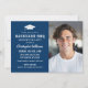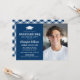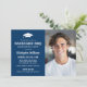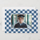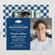 O convite de festas "CHURRASCO de quintal" apresenta uma foto do formando com o motivo do boné de formatura, texto na moda personalizado em fontes rústicas e modernas, um deslocamento e designs de padrão de xadrez e texto branco. O fundo azul escuro do marinho e o padrão de xadrez da mesa gingham na parte traseira da placa podem ser personalizados. Perfeito para uma festa de formatura casual de verão ao ar livre.