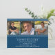 Anuncie seu segundo grau ou formando universitário em estilo com um cartão de graduação de três fotos com detalhes de stripe e uma formulação moderna de convite para sans serif. Marinho escuro / design azul índigo e branco. Personalize para adicionar três fotos, seu anúncio de graduação e detalhes do convite de festas.