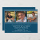Anuncie seu segundo grau ou formando universitário em estilo com um cartão de graduação de três fotos com detalhes de stripe e uma formulação moderna de convite para sans serif. Cor azul e design branca clássica. Personalize para adicionar três fotos, seu anúncio de graduação e detalhes do convite de festas.